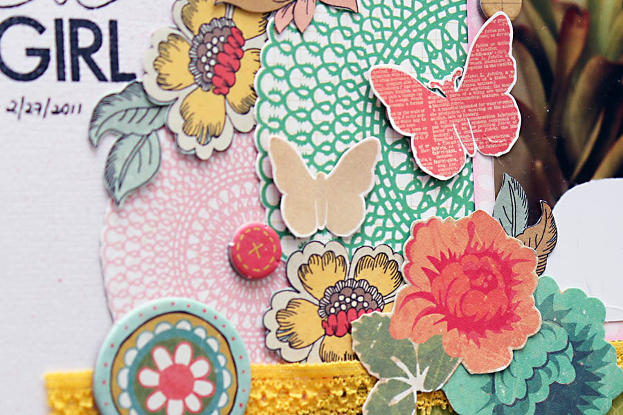 This is Iris again sharing a layout I made from the May Kit "Lawn Party". You can really maximize your papers by cutting out the designs and making embellishments out of it...